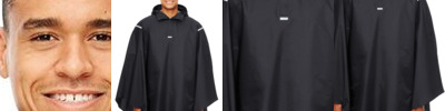 1.5 oz./yd², 100% polyester taffeta with water-resistant finish Encased elastic at hood opening for superior weather protection Reflective tape details at front and back shoulders and placket Two-snap closure at placket with dyed-to-match plastic snaps Packable into self back pocket with hook and loop closure Shockcord at lower hem for added weather protection