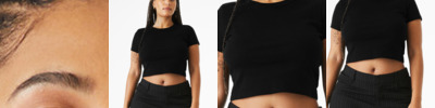 Stretch fit Crewneck binding Set-in cap sleeve 1x1 micro rib Side seamed Mid-length Tear-away label 5.4-ounce, 52/48 Airlume combed and ring spun cotton/polyester, 32 singles Athletic Heather/Black: 90/10 Airlume combed and ring spun cotton/polyester