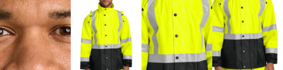 This lightweight jacket is jobsite-ready, provides protection against the rain and meets the highest class of visibility. 100% polyester oxford with water-resistant finish Black bottom front and lower sleeves for a cleaner appearance Fully seam sealed 3-panel hood that stows in collar Durable, reflective 2-inch tape meets ANSI 107 requirements and provides 360-degree visibility on body and sleeves Full-length exterior storm flap with snap closure Adjustable cuffs with hook and loop closures Two lower front pockets with flaps Adjustable drawcord hem This garment must be fully zipped to be in compliance with ANSI 107 standards